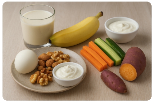 - 소화 용이성: 기름지거나 자극적인 음식은 피하고, 소화가 쉬운 재료를 선택한다. 예를 들어, 삶은 달걀이나 채소 위주의 간식은 위장에 부담이 적다.