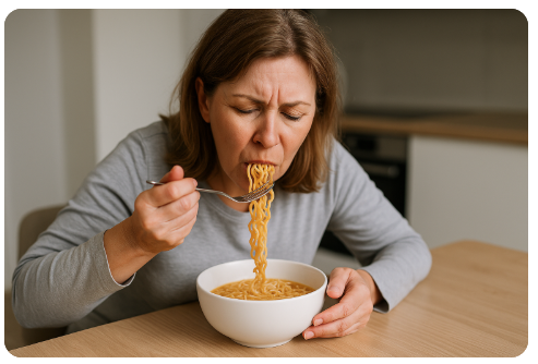 • 50대 팁: 라면(1봉)+계란(1개)+채소, 칼로리 30%↓.