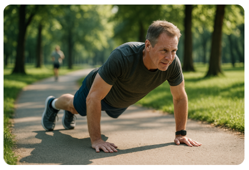 - 맨몸 운동: 푸시업, 스쿼트, 플랭크 등 체중을 활용한 운동으로 근력을 키운다.